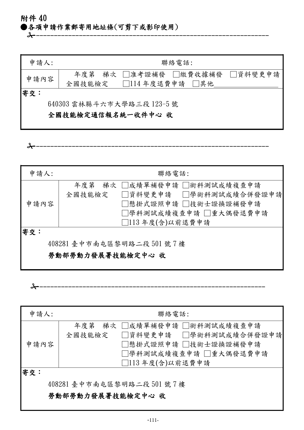 全國技術士技能檢定退費相關資料請寄回:408281臺中市南屯區黎明路二段 501號7樓 勞動部勞動力發展署技能檢定中心收,可使用附件40 各項申請作業郵寄用地址條寄送。